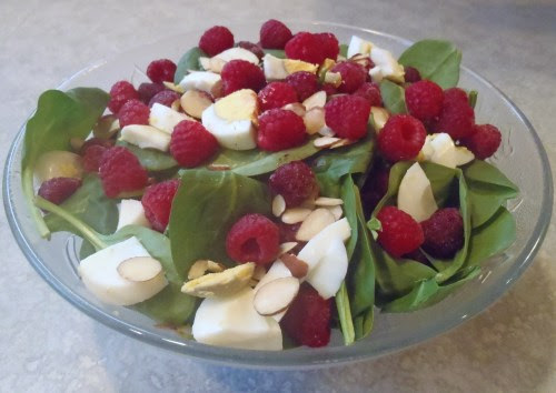 - Meal 3 (3:00 pm) – spinach salad with raspberries, almonds, boiled egg, homemade tangerine balsamic vinaigrette . 2 cups water.